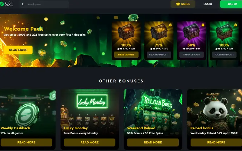 Користувацький досвід також був для нас ключовим фактором оцінки. Під час тестування нас вразив чистий і сучасний веб-сайт казино OSH з його темно-зеленою кольоровою гамою.
